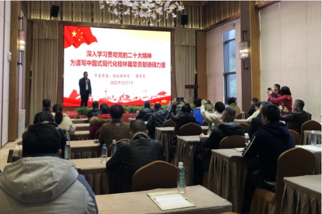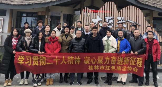 桂林市红色旅游协会于2022年12月6日至7日组织协会部分会员单位负责人在本市及兴安、全州等地开展了红色旅游线路考察;协会还邀请到桂林市委常委、统战部部长蒋育亮为参加本次活动的协会单位负责人宣讲了题为“深入学习贯彻党的二十大精神,为谱写中国式现代化桂林篇章贡献磅礴力量”的演讲报告,深刻阐述了党的二十大报告是马克思主义中国化时代化纲领性文献,是我们党面向未来的伟大政治宣言,是实现中华民族伟大复兴新征程上的行动指南;党的二十大是高举中国特色社会主义伟大旗帜,全面贯彻习近平新时代中国特色社会主义思想,弘扬伟大建党精神,自信自强、守正创新,踔厉奋进、勇毅前行,为全面建设社会主义现代化国家、全面推进中华民族伟大复兴而团结奋斗。桂林红色旅游协会会员单位将牢记习近平总书记在广西4·27的重要讲话和殷殷嘱托,深入学习党的二十大精神,践行“发展社会主义先进文化,弘扬革命文化,传承中华优秀传统文化”和“讲好中国故事、传播好中国声音”,讲好桂林的红色故事,以实际行动为建设桂林世界级旅游城市贡献桂林红协力量。
