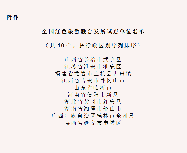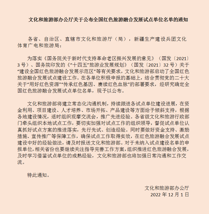 近日,文化和旅游部办公厅发布关于公布全国红色旅游融合发展试点单位名单的通知,全文如下——