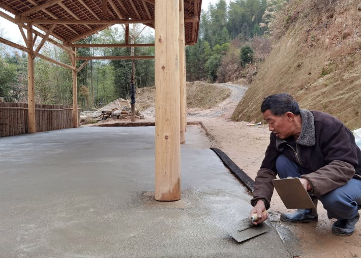 ▲2月2日,在昔日红军长征经过的广西兴安县华江瑶族乡高寨村,脱贫户杨盛友正在修建自家的农家乐。(新华社记者向志强 摄)