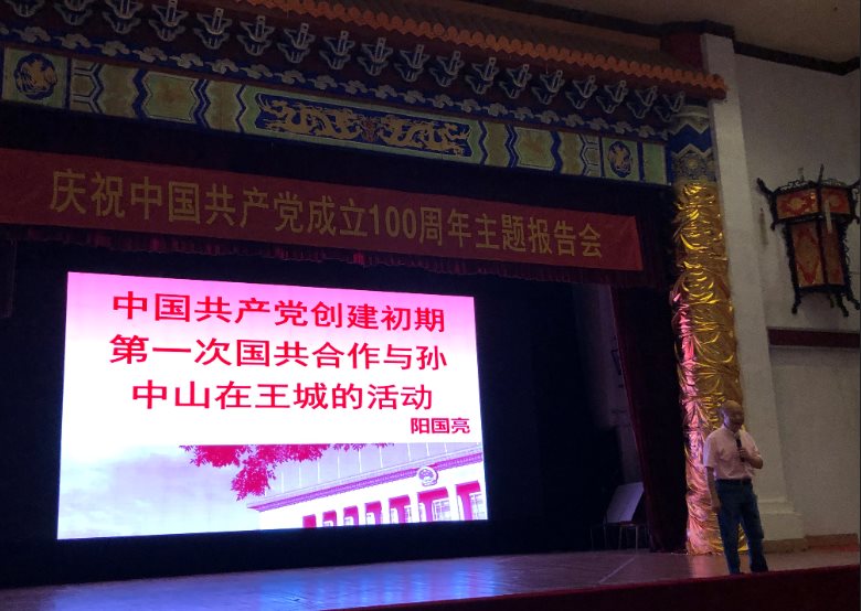 阳教授讲述了建党初期,面对帝国主义、封建势力强大的敌人,中国共产党认识到,结成广泛的统一战线的重要性,决定采取积极的步骤,去联合孙中山领导的中国国民党,1921年12月孙中山在王城多次与中国共产党党员张太雷、共产国际代表马林三次长谈,达成了思想的一致和合作的可能。1924年1月在共产党的参加和帮助下,孙中山在广州组织召开国民党第一次代表大会,会上通过了由共产党起草的反帝反封建为主要内容的宣言,确定了“联俄、联共、扶助农工”的三大政策,实现了第一次国共合作。孙中山在王城的活动,为国共合作打下了基础。国共合作的实现,促进了工农运动的恢复和发展,开创了反帝反封的革命新局面。中国共产党在大革命时期进行轰轰烈烈的革命,在全国范围内掀起反帝反封建的伟大斗争,在中国革命史和党的百年奋斗史中写下可歌可泣的一页。