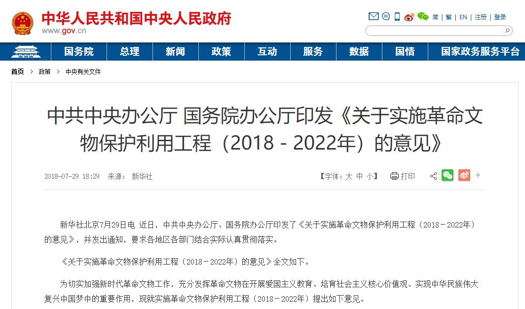 中共中央办公厅 国务院办公厅印发《关于实施革命文物保护利用工程(2018-2022年)的意见》