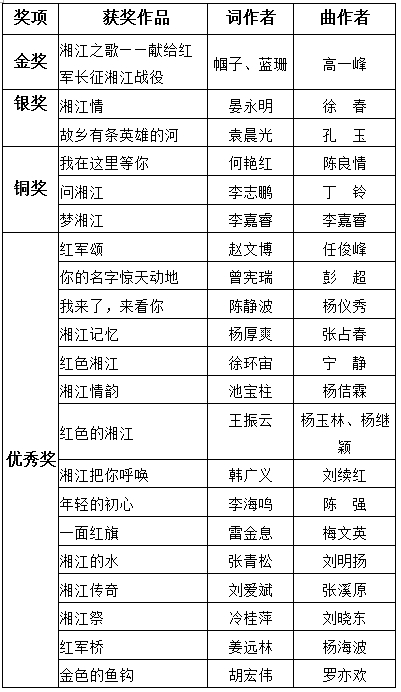 按照“公开、公正、公平”的原则,通过组委会遴选、组织专家评审的方式,对所有参赛作品进行初评和复评,选出获奖作品。大赛按桂林红军长征湘江战役文化宣传语、形象标识、文创产品、歌曲四个类别,分设金奖、银奖、铜奖和优秀奖。现将获奖名单通知如下: