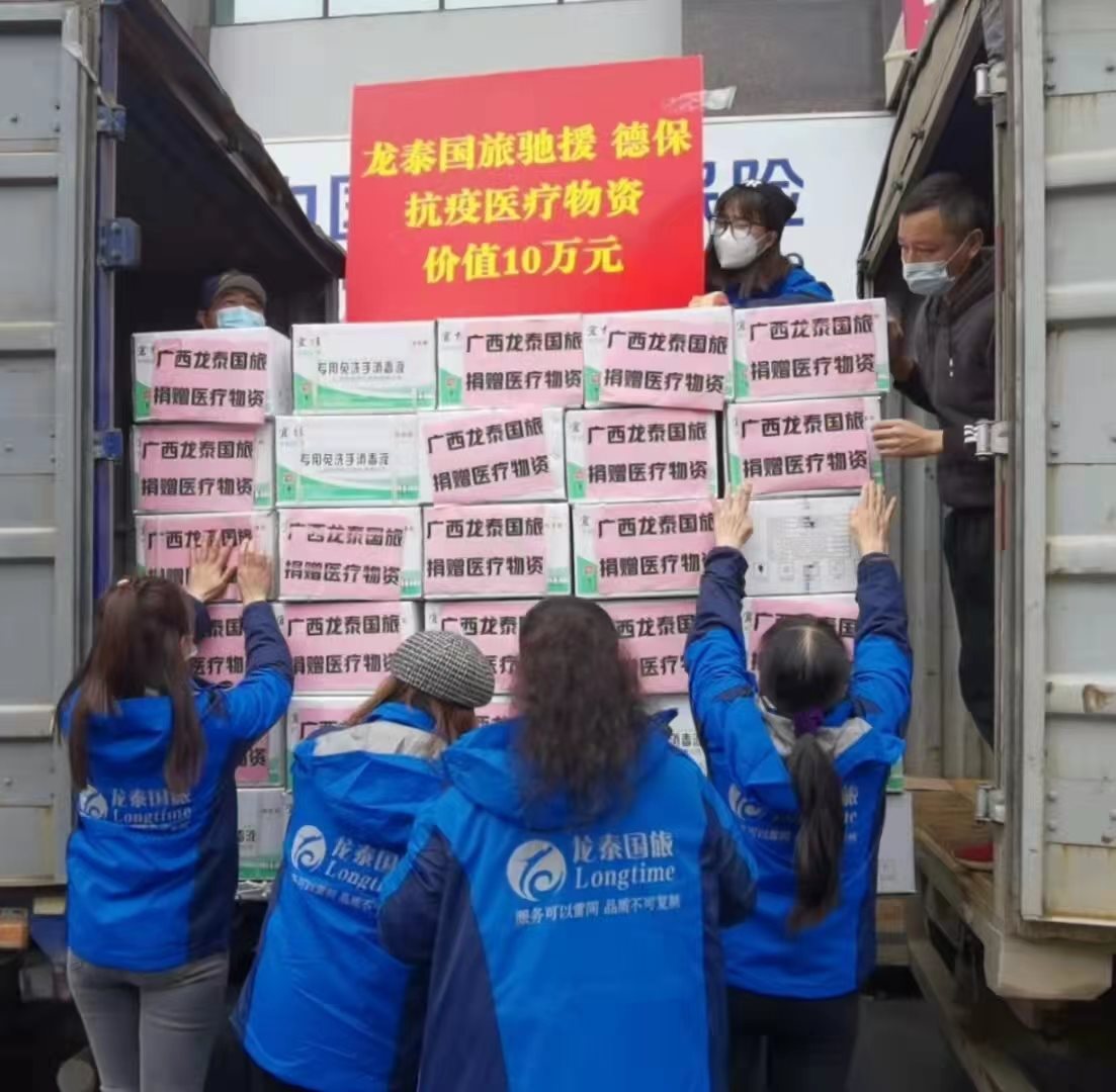 疫情爆发以来,广西龙州红文化旅游有限公司以及广西龙泰国际旅行社有限公司,传承弘扬社会正能量,依据相关抗疫捐献文件,分别向崇左龙州县和百色德保县捐赠医用外科口罩、专用免洗手消毒液、次氯酸钠消毒液、饮用水、方便面等累积价值13万元的防疫物资。虽然近两年旅游业受到前所未有的打击,但是作为有担当有责任的企业,为打赢疫情阻击战,为抗击疫情,贡献出一份力量,用爱心为抗击疫情助力,共同战“疫”,一起向未来!